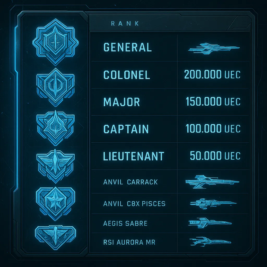 | Lieutenant | 25 recruits | 15,000 UEC, Permanent access to 3 ships in Arena Commander |